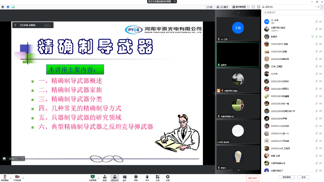 2022年12月2日上午9:30,河南平原光电有限公司赵路民研高工应邀为公司作题为“精确制导武器系统”的线上讲座。本次讲座由教学经理蔡长龙主持,经理郭永春、公司教师及全体研究生参加讲座。
