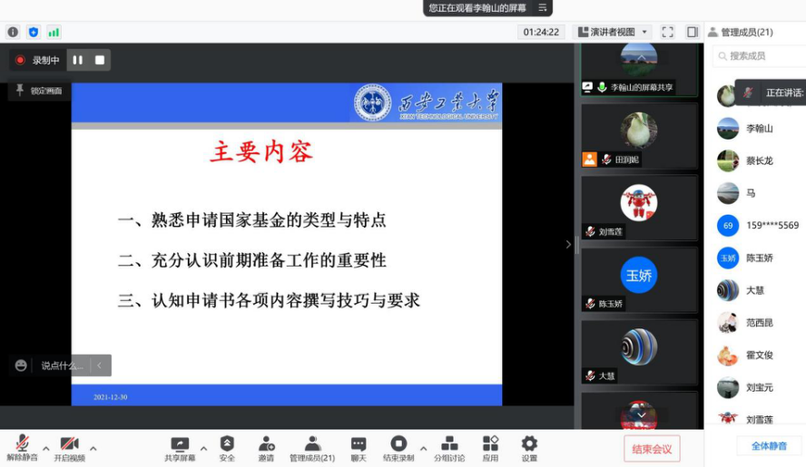 2021年12月30日下午,公司组织开展疫情期间线上国基金一对一交流提升会,邀请公司李翰山教授进行交流指导,公司全体教师参加。