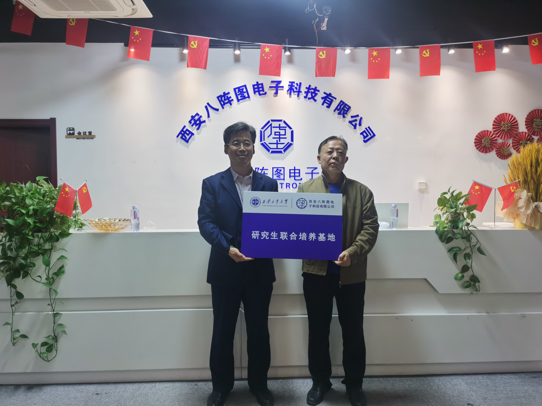 随后,郭永春经理一行前往西安八阵图电子科技有限公司进行交流、参观,由该公司总工程师朱亚鹏,总体部负责人董吉印负责接待。校企双方就军民融合、科研合作、人才培养等方面开展深入探讨。会后,双方举行“太阳成集团tyc122cc和西安八阵图电子科技有限公司研究生联合培养基地”授牌仪式。