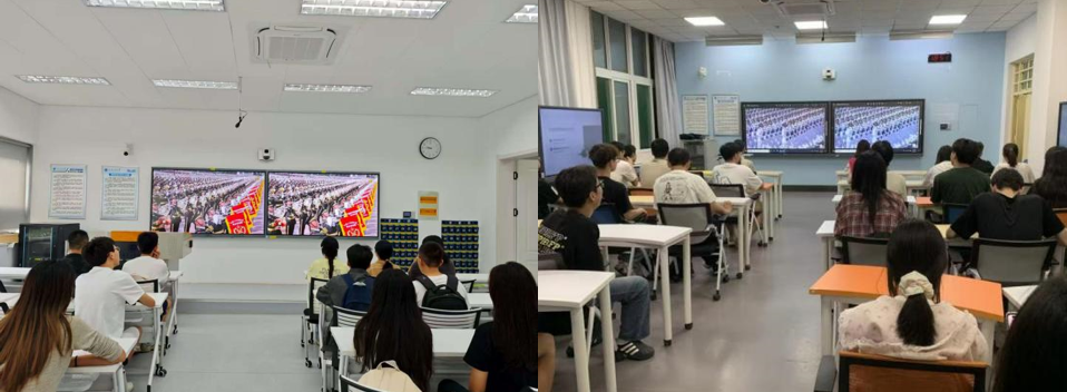教室里、会议厅内,气氛庄严而热烈,师生们早早来到会场,等待阅兵式的开始。56门礼炮80响轰鸣展现大国威仪,师生全体起立,在庄严肃穆的国歌中目光坚定地注视着屏幕中的五星红旗冉冉升起。阅兵式上,随着“分列式,开始!”整齐划一的方队、铿锵有力的步伐、先进精良的武器装备,全面展现了我国国防和军队现代化建设的辉煌成就,展示了国家强大实力和崭新形象。观看过程中,师生们共同见证人民军队的飒爽英姿与祖国的强盛风采,为先烈们以铮铮铁骨战强敌、血以肉之躯筑长城的精神动容,更为祖国的强大军事力量和国防建设成就感到骄傲。