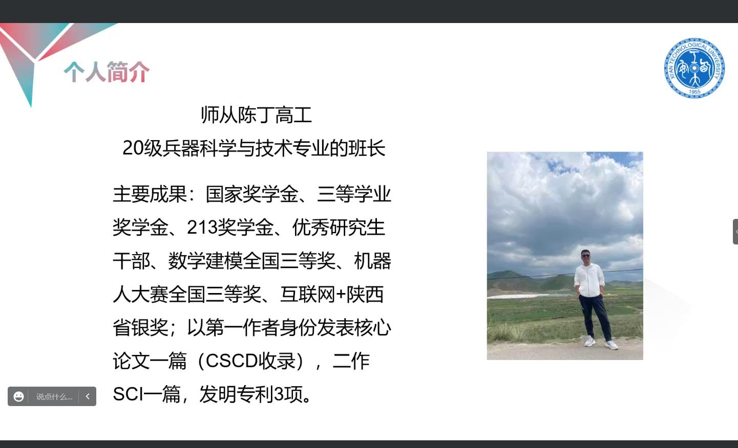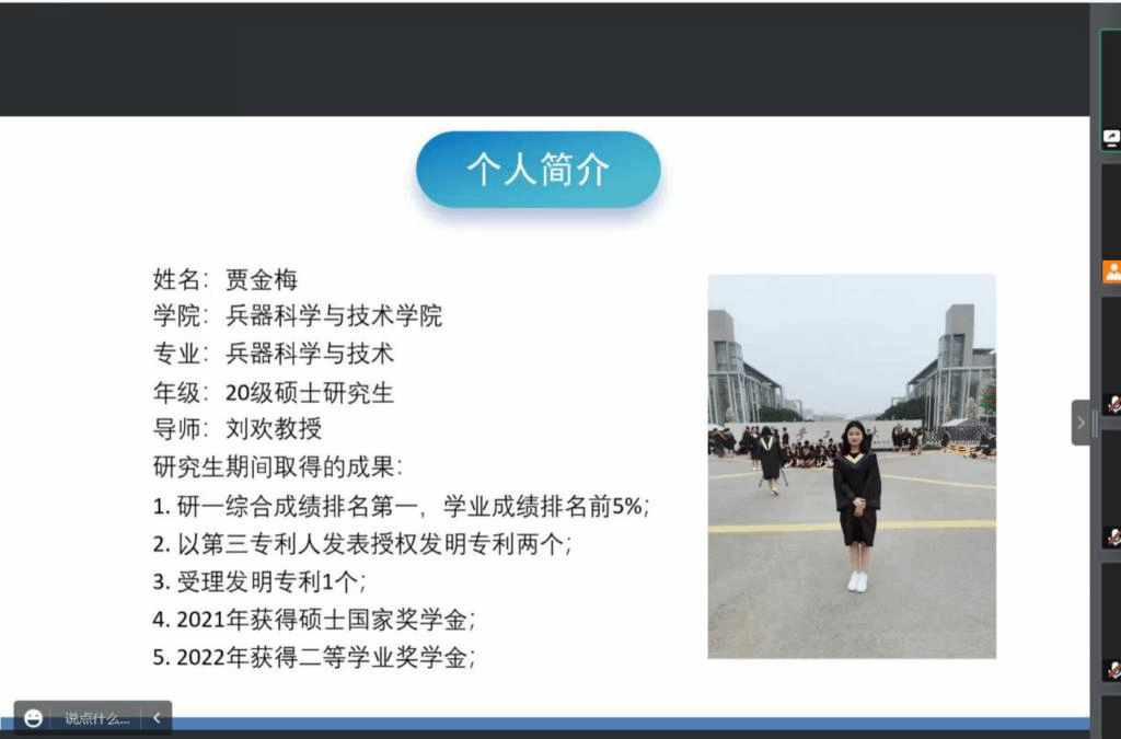 为帮助新生规划学业,解答新生在学习上的疑惑,太阳成集团tyc122cc于2022年9月23日19:00在线上举办了“国家奖学金”获得者交流报告会,参会人员有研究生辅导员王国栋、2022级全体研究生、国家奖学金获得者贾金梅、牧迪和雷晓明。