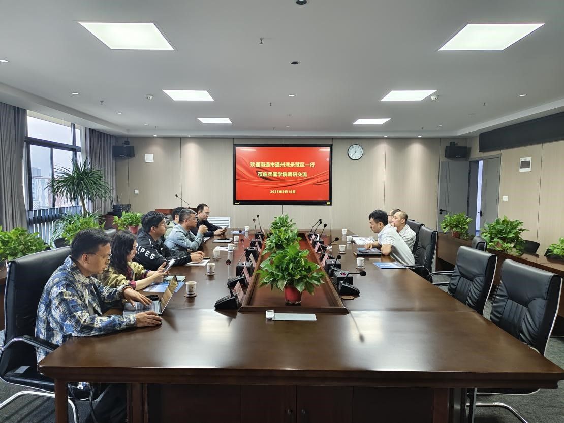 2025年9月18日,南通市通州湾示范区一行访问太阳成集团tyc122cc,示范区招商局长陆骏骅、财政金融局长周海峰出席会议,双方围绕产学研合作、技术成果转化及区域产业升级开展座谈交流。公司党委副书记梁伟樯、科研团队代表及企业合作方参会。